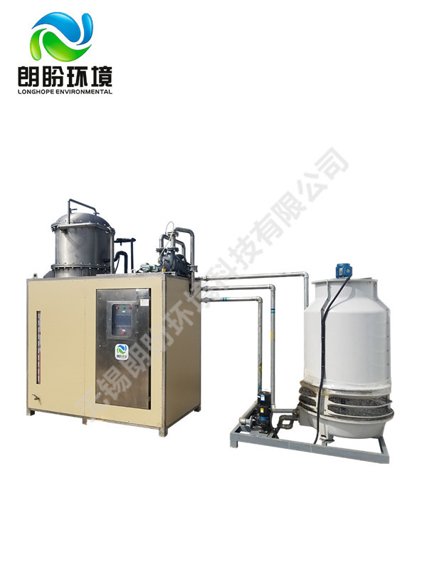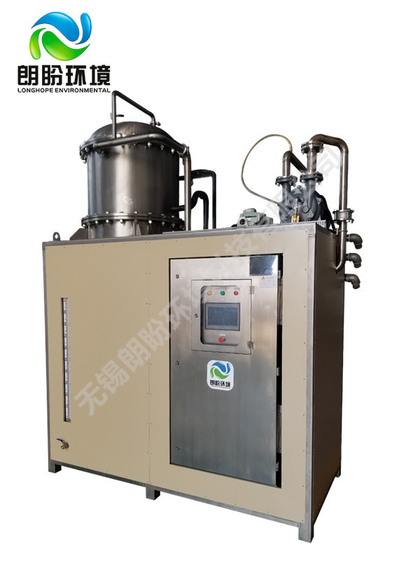 低溫蒸發(fā)結(jié)晶器的原理是物料的沸點(diǎn)隨著壓強(qiáng)的降低而降低。低溫節(jié)能濃縮設(shè)備整體保持真空狀態(tài),蒸發(fā)室的真空度約為95%~97%,在此壓強(qiáng)下水的沸點(diǎn)為35℃~37℃,系統(tǒng)無需配備進(jìn)料泵,利用蒸發(fā)室的負(fù)壓將物料吸進(jìn)蒸發(fā)室,通過強(qiáng)制循環(huán)方式將物料循環(huán)霧化,傳輸至換熱器上,物料中水分被蒸發(fā),物料連續(xù)循環(huán)霧化,通過蒸發(fā)室液位自動(dòng)補(bǔ)料,濃度達(dá)到要求后作為濃縮液排出設(shè)備。濃縮液一般粘度較大,需采用泵抽出。