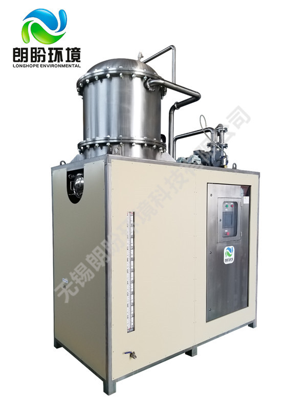 熱泵濃縮蒸發(fā)器的原理是物料的沸點(diǎn)隨著壓強(qiáng)的降低而降低。低溫節(jié)能濃縮設(shè)備整體保持真空狀態(tài),濃縮室的真空度約為95%~97%,在此壓強(qiáng)下水的沸點(diǎn)為35℃~37℃,系統(tǒng)無(wú)需配備進(jìn)料泵,利用蒸發(fā)室的負(fù)壓將物料吸進(jìn)蒸發(fā)室,通過(guò)強(qiáng)制循環(huán)方式將物料循環(huán)霧化,傳輸至換熱器上,物料中水分被蒸發(fā),物料連續(xù)循環(huán)霧化,通過(guò)蒸發(fā)室液位自動(dòng)補(bǔ)料,濃度達(dá)到要求后作為濃縮液排出設(shè)備。濃縮液一般粘度較大,需采用泵抽出。
