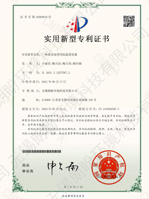 無錫朗盼環(huán)境科技有限公司是一家集研發(fā)、生產(chǎn)、銷售為一體的高新技術(shù)公司。主要生產(chǎn)低溫?zé)岜谜婵照舭l(fā)器和結(jié)晶器等污水處理設(shè)備、以高濃高鹽廢水蒸發(fā)處理、液態(tài)危險廢棄物濃縮減量和物料資 源化回收為主營業(yè)務(wù),為客戶提供工業(yè)污水零排放低溫蒸發(fā)技術(shù)整 體解決方案。公司積極響應(yīng)國家號召,秉承著“綠色環(huán)保,節(jié)能 減排”的企業(yè)愿景,全力推動企業(yè)向科技創(chuàng)新、品牌創(chuàng)新的方向發(fā)展 是國內(nèi)第一家研發(fā)、制造低溫熱泵蒸發(fā)器、第一個申請發(fā)明專利的廠 家。并取得多項國家發(fā)明、實用專利及軟著證書40余項及江蘇省工業(yè)與信息化廳新技術(shù)新產(chǎn)品認(rèn)定證書。