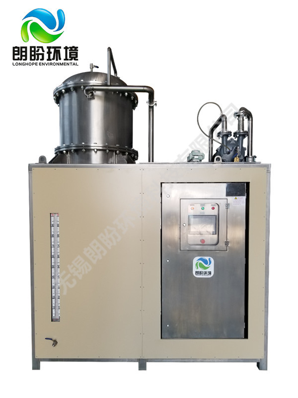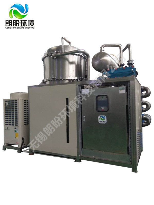 熱泵濃縮蒸發(fā)器的原理是物料的沸點(diǎn)隨著壓強(qiáng)的降低而降低。低溫節(jié)能濃縮設(shè)備整體保持真空狀態(tài),濃縮室的真空度約為95%~97%,在此壓強(qiáng)下水的沸點(diǎn)為35℃~37℃,系統(tǒng)無(wú)需配備進(jìn)料泵,利用蒸發(fā)室的負(fù)壓將物料吸進(jìn)蒸發(fā)室,通過(guò)強(qiáng)制循環(huán)方式將物料循環(huán)霧化,傳輸至換熱器上,物料中水分被蒸發(fā),物料連續(xù)循環(huán)霧化,通過(guò)蒸發(fā)室液位自動(dòng)補(bǔ)料,濃度達(dá)到要求后作為濃縮液排出設(shè)備。濃縮液一般粘度較大,需采用泵抽出。